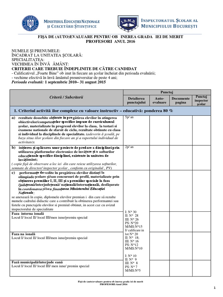 Fişa de autoevaluare/evaluare personal didactic. Cele mai interesante stiri despre gradatii merit 2016. Contestatiile pot fi depuse pana la data de 1.11.2016 ora 1545.